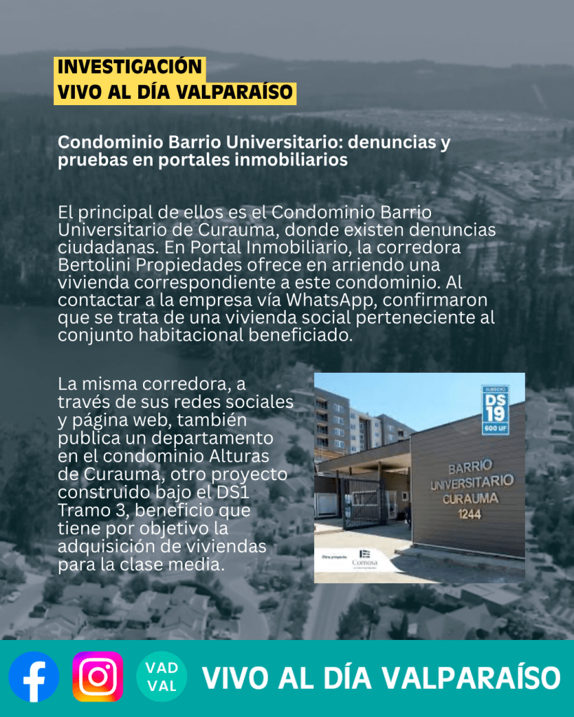 El caso más evidente es el del Condominio Barrio Universitario de Curauma, donde existen denuncias ciudadanas. En Portal Inmobiliario, la corredora Bertolini Propiedades ofrece una de estas viviendas en arriendo. Al contactarlos vía WhatsApp, confirmaron que se trata de una propiedad social adquirida con subsidio habitacional.