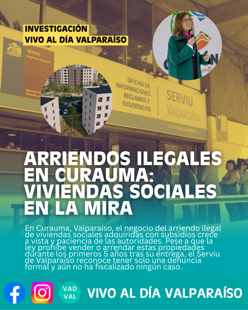 En Curauma, Valparaíso, el negocio del arriendo ilegal de viviendas sociales adquiridas con subsidios DS1 y DS19 crece a vista y paciencia de las autoridades. Pese a que la ley prohíbe vender o arrendar estas propiedades durante los primeros 5 años tras su entrega, el Serviu de Valparaíso reconoce tener solo una denuncia formal y aún no ha fiscalizado ningún caso.