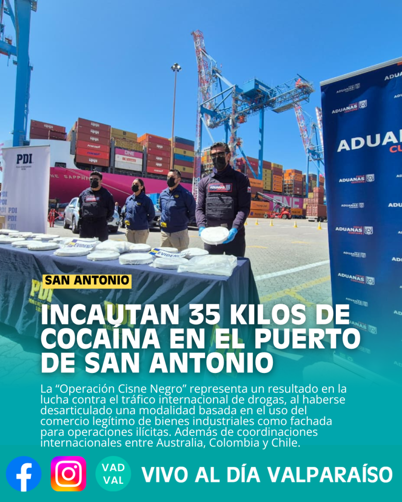 ⭕️ SAN ANTONIO| La denominada “Operación Cisne Negro” comenzó dentro del foco portuario de tráfico marítimo regional en el que la Aduana Regional de Valparaíso, identificó a empresas que realizaban importaciones desde Colombia a través de los puertos de San Antonio y Valparaíso, para posteriormente concretar exportaciones vía aérea desde el Aeropuerto Internacional de Santiago.
