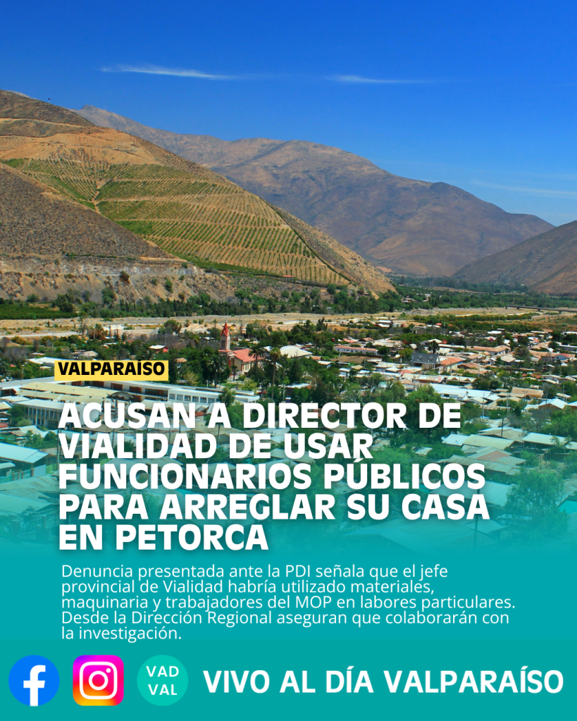 ⭕️ DENUNCIA| El jefe provincial de Vialidad de Petorca, Daniel Hidalgo Cardoza, fue denunciado ante la Policía de Investigaciones por presuntamente ordenar a funcionarios bajo su cargo realizar trabajos en su domicilio particular, utilizando recursos del Estado y maquinaria institucional.