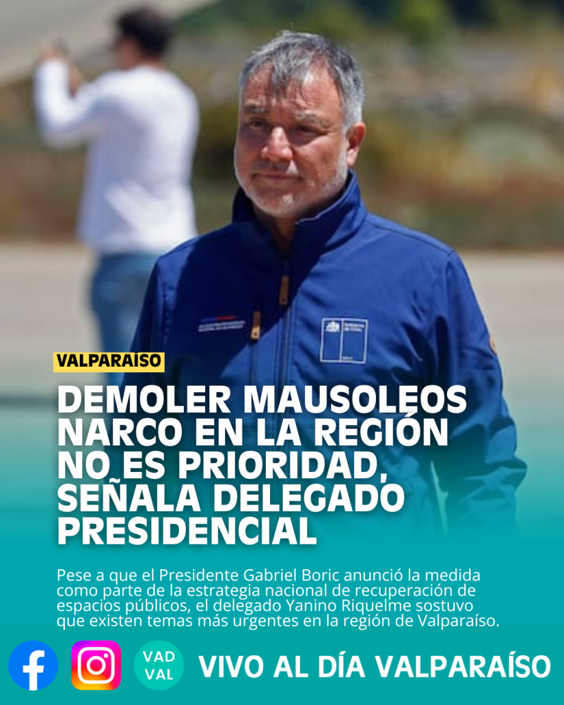 A más de dos años del anuncio presidencial sobre la demolición de mausoleos vinculados al narcotráfico, la autoridad regional descartó que la medida sea una prioridad en Valparaíso. El delegado presidencial Yanino Riquelme explicó que la iniciativa se ha enfocado principalmente en la Región Metropolitana, donde existe un mayor número de estos recintos y simbolismos asociados al crimen organizado.
