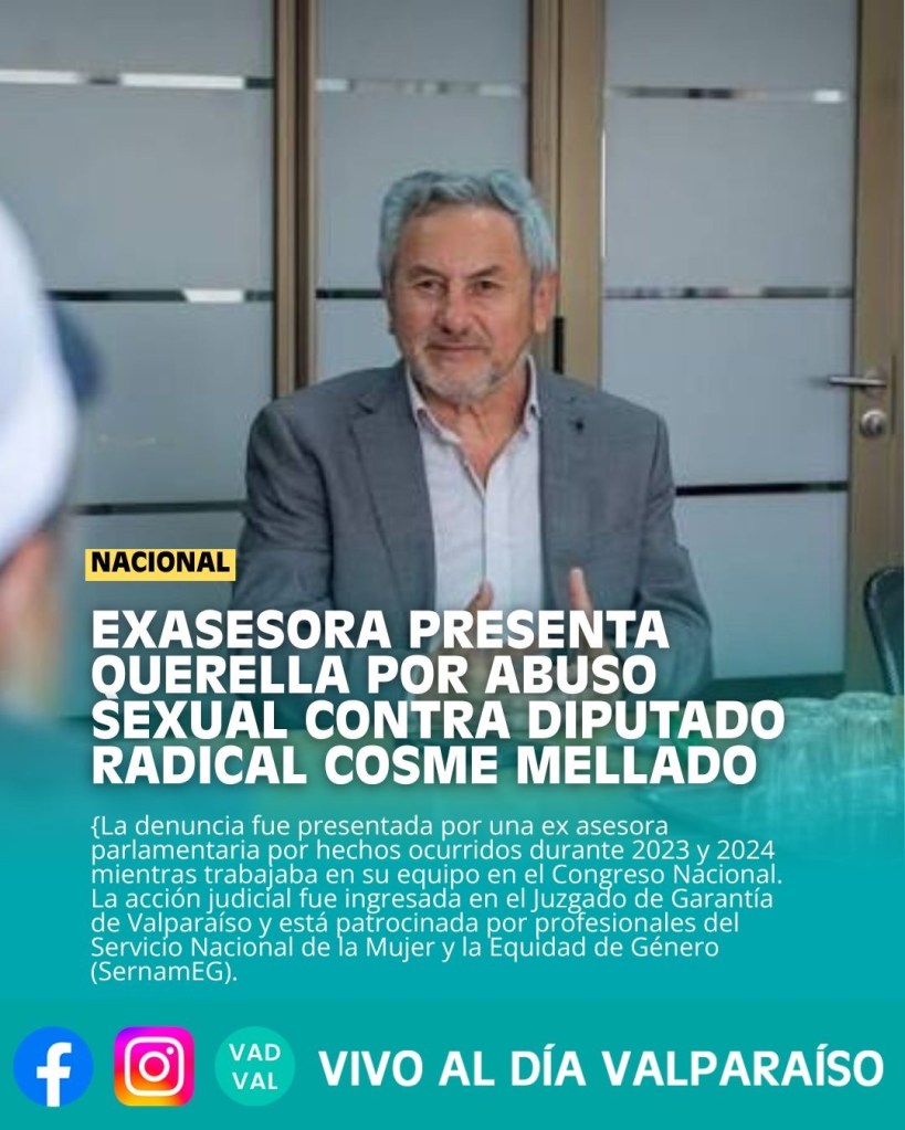 Una exasesora legislativa presentó una querella por abuso sexual en contra del diputado Cosme Leopoldo Mellado Pino, militante del Partido Radical, por hechos ocurridos durante 2023 y 2024 mientras trabajaba en su equipo en el Congreso Nacional. La acción judicial fue ingresada en el Juzgado de Garantía de Valparaíso y está patrocinada por profesionales del Servicio Nacional de la Mujer y la Equidad de Género (SernamEG).