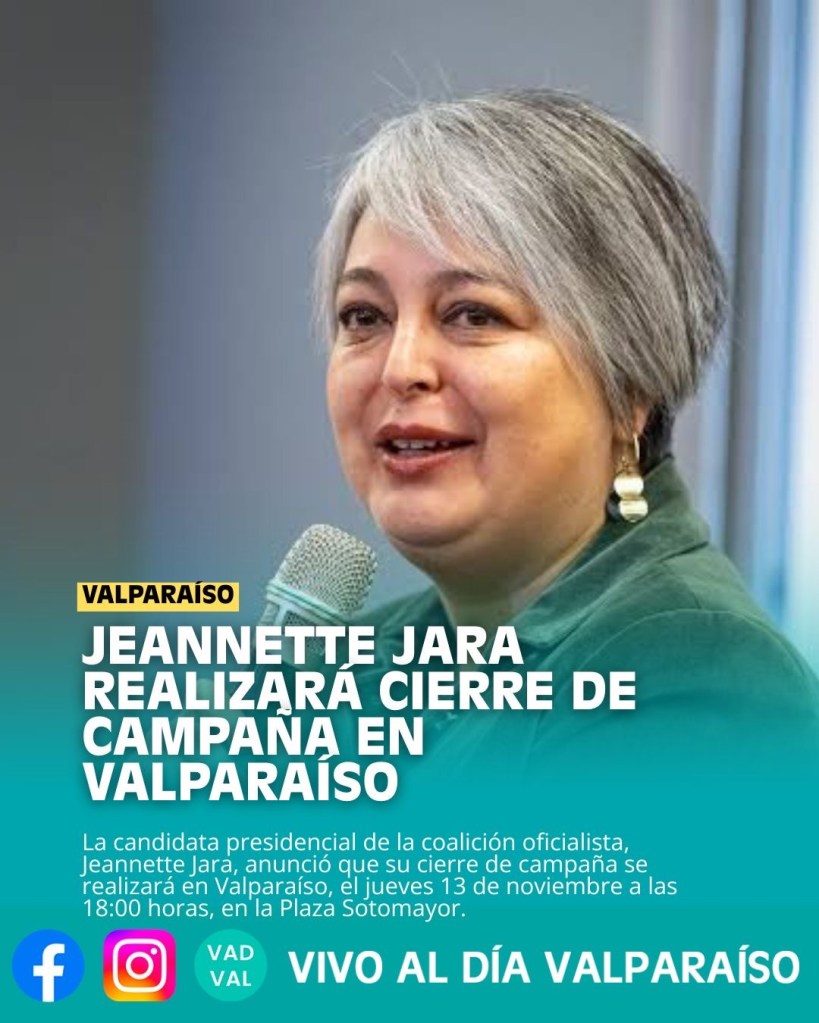 La candidata presidencial de la coalición oficialista, Jeannette Jara, anunció que su cierre de campaña se realizará en Valparaíso, el jueves 13 de noviembre a las 18:00 horas, en la Plaza Sotomayor.