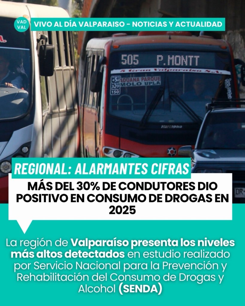 El informe muestra resultados de controles realizados a choferes de locomoción colectiva y buses, donde se detectó presencia de distintas sustancias, generando fuerte preocupación por la seguridad de pasajeros y peatones. La situación impacta directamente a miles de personas que a diario utilizan el transporte público en ciudades como Valparaíso, Viña del Mar, Quilpué y Villa Alemana.