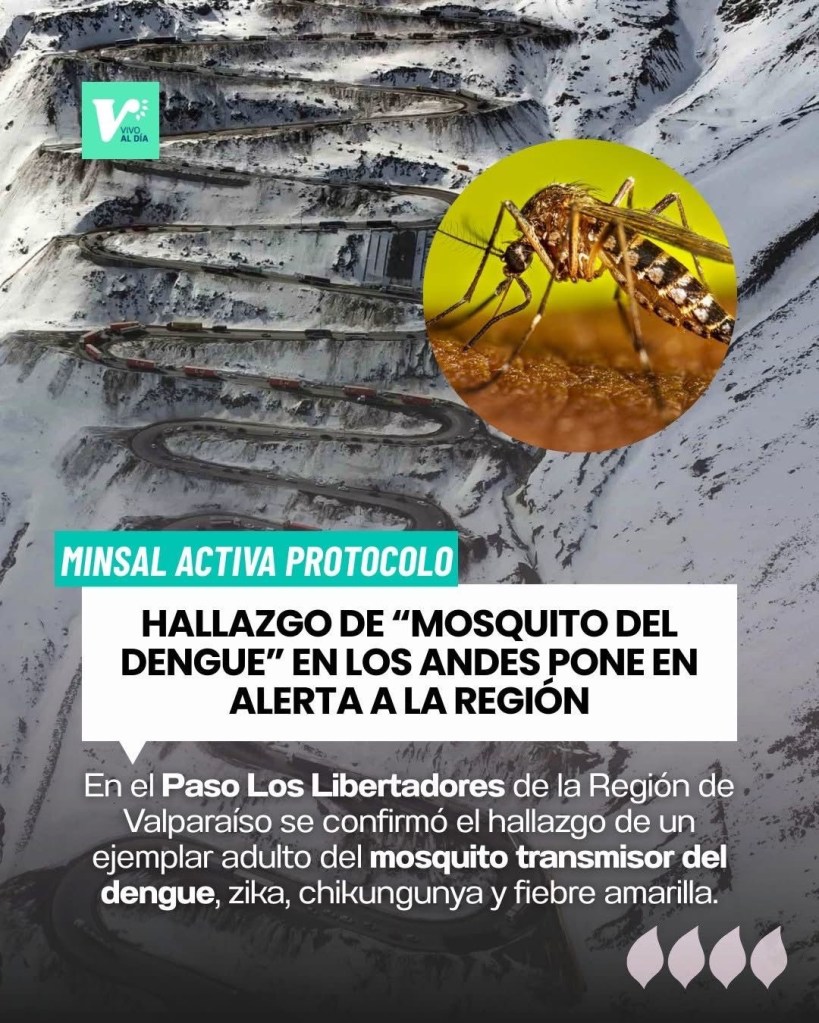 El Ministerio de Salud informó el hallazgo de un ejemplar adulto de mosquito Aedes aegypti en el Paso Los Libertadores, en la Región de Valparaíso, durante la semana epidemiológica 6. La identificación fue confirmada por el Instituto de Salud Pública (ISP), y se trata de un vector capaz de transmitir dengue, zika, chikungunya y fiebre amarilla.