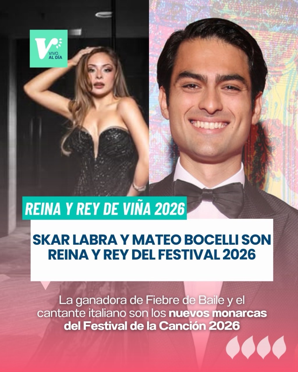 ¡Hay nuevos soberanos en la Ciudad Jardín! Skarleth Labra y Matteo Bocelli son los flamantes ganadores de la elección de Embajadores de Viña 2026. En una jornada marcada por el voto popular y de los comunicadores, la representante de Chilevisión y el artista italiano consolidaron su popularidad en el certamen. Mientras Skar celebra su éxito tras «Fiebre de Baile», Matteo suma un nuevo triunfo tras su ovacionada presentación en la Quinta Vergara. La ceremonia oficial y el esperado piscinazo se llevarán a cabo este jueves, continuando con la tradición que paraliza a la región en época festivalera.